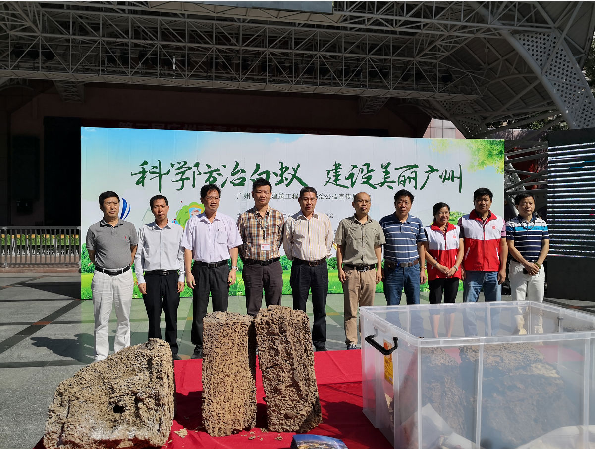 慶典主席臺 : 中為會長陳享環,左1為專家委員會副主任彭展金,左2為專家委員會副主任田偉金,左3為專家委員會主任李奕震,左4為協會支部書記胡偉權,左6為深圳市白蟻防治行業協會會長劉可華,左7為珠海市白蟻防治行業協會會長石昌坤,左8為佛山市白蟻防治協會會長劉瑞橋,左9為東莞市白蟻防治協會秘書長張國賢。